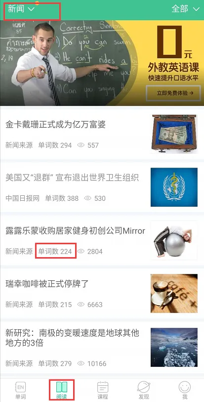 说明:在”阅读“菜单栏可以看热点新闻,但没有中文解释哦,每篇文章可以查看单词数,另外,在新闻的下拉菜单栏可以选择新闻的类别,阅读文章时,不懂的词汇可以选中看解释和加入自己的生词本(右上角的小书本图标)。