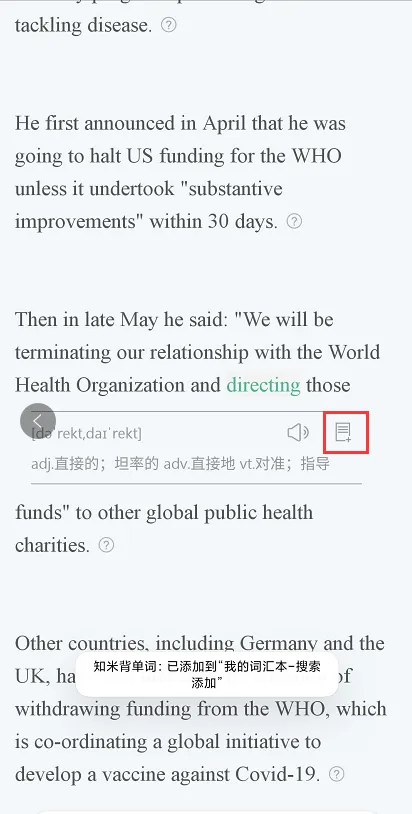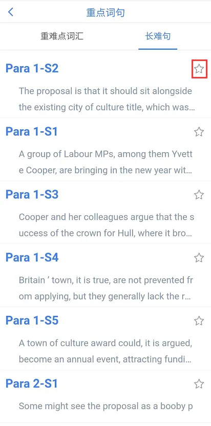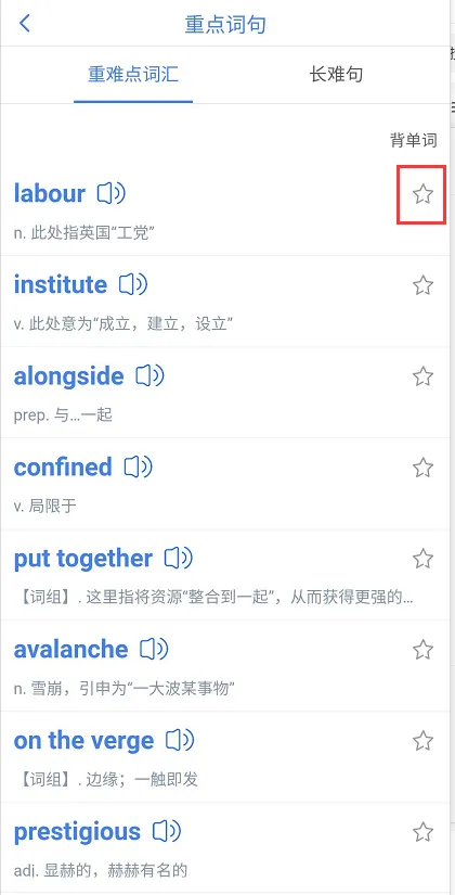 说明:最左边小红框点击可以进入词汇、长难句的学习界面,针对陌生的单词、长难句可以点击旁边的星星进行收藏,进入自己的单词本,长难句或者是整篇文章都是可以进行收藏的,方便后面的复习。对于文中不认识的单词单击即可收藏