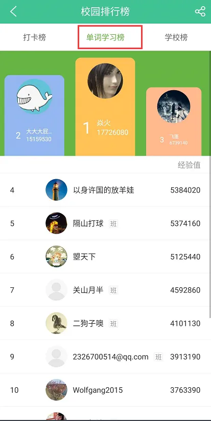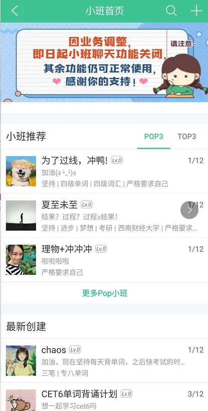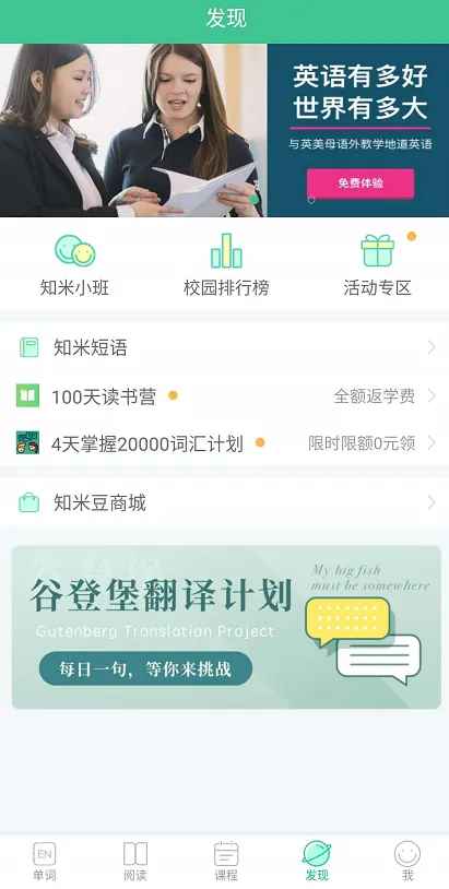 说明:“发现”菜单栏下的知米小班和校园排行榜,可以根据自己的需要选择加入,组团学习与打卡,相互监督。