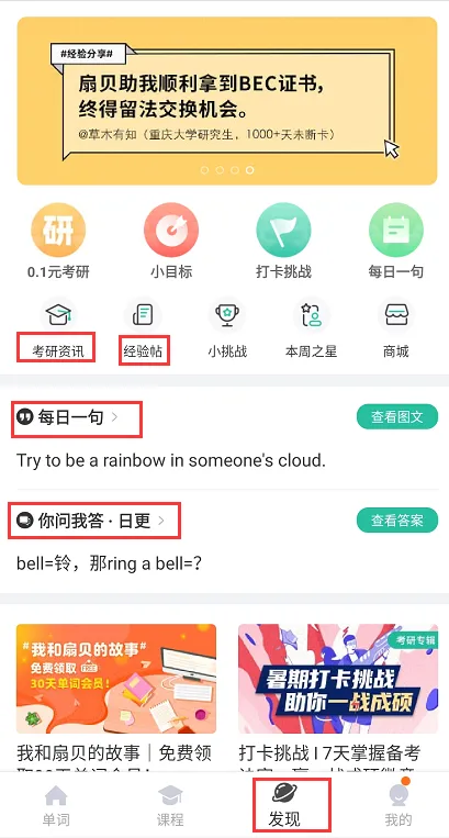 1. 功能:集背单词、每日一句卡片、单词扩展测试、考研咨询、经验贴等为一体。