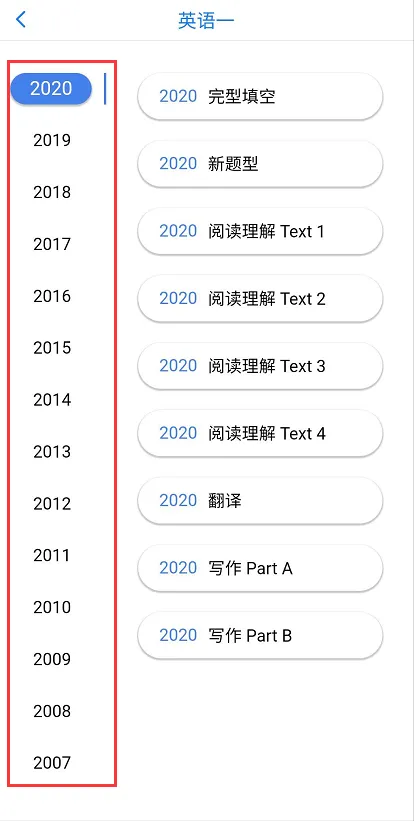 说明:软件会把真题分成不同的题型来展示,如20年新题型、完形填空、阅读理解Text 1等等,囊括全部年份的真题。