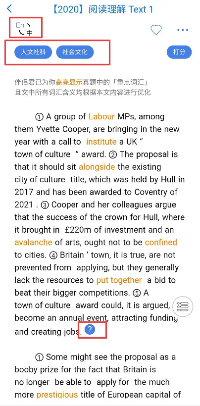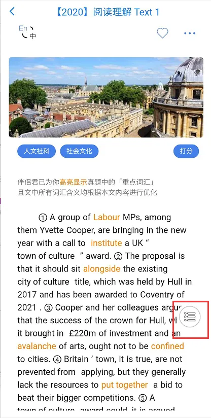 进入各个题型的界面,如阅读理解,可以全英文展示或者中英文间隔展示。