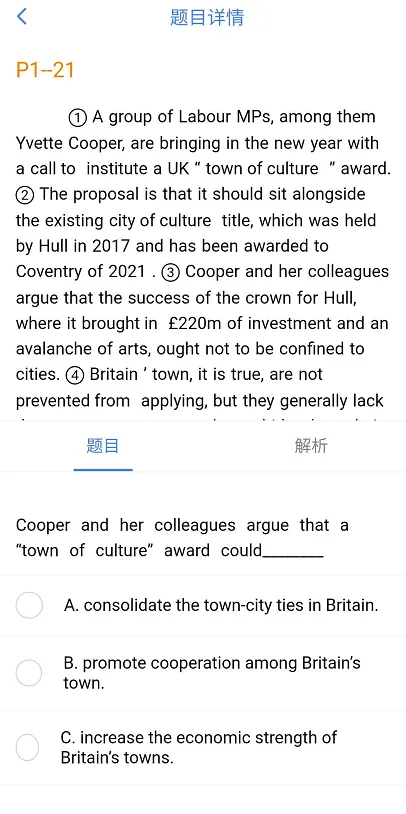 点击真题界面蓝色的小问号,进入做题阶段,此外,针对题目,软件中还会对答案进行解析,解析的过程非常详细,还会帮大家归纳题型,如细节题。
