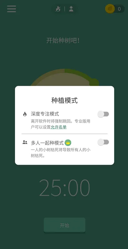 说明:这种种树的专注模式有3种,一种是普通种树,中间可以切出去看任何你想看的APP内容,(默认情况均为这个模式),在图1中点击最上面的红框即可设定其他两种工作模式,即深度专注模式,开启这个模式之后一旦你离开这个软件的界面,小树就会枯死。另外一种模式为多人一起种模式,这个模式下是多人一起种树,只要其中一人的树枯死,其他人的树也会一起遭殃。