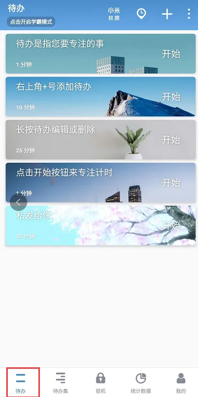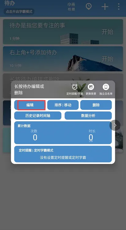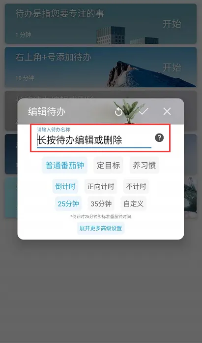 说明:在“待办”菜单栏可以看见待办事项清单,点击进入开始基本的编辑,编辑待办的名称、专注时间。