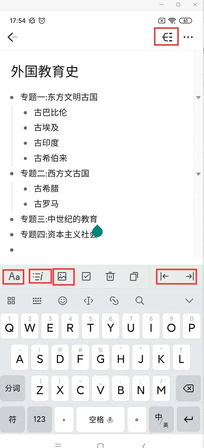 说明:根据自己对知识点的整理和理解绘制思维导图。在这个界面可以调节字体样式,添加注释、插入图片等等,宝宝注意区分一级标题和二级标题,如上图所示,一级标题为专题一,二级标题为古巴比伦。一级二级标题是通过最右边的左缩进和右缩进来实现的。