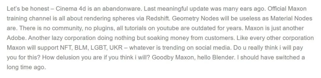 说实话,Cinema 4d算是废了。上一次有意义的更新还是上一次。Maxon官方培训频道是关于用Redshift渲染球体的。几何节点跟材质节点一样没用。没有社区,没有插件,youtube上的所有教程都已过时多年。Maxon只是另一个 Adobe。公司除了从客户那里敛财外基本什么都没做。像其他所有公司一样,Maxon将支持NFT、BLM、LGBT、UKR——跟上社交媒体的新趋势。你真的认为我会为此付钱给你吗?如果你认为我会,你错了?再见Maxon,你好Blender。我应该很久以前就该换了。