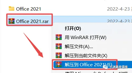1.选中下载的压缩包,然后鼠标右键选择解压到”Office 2021″(没有解压选项点这里)