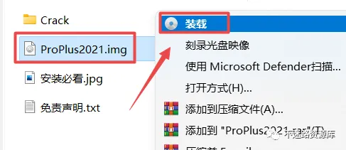 2.打开刚刚解压的文件夹,鼠标右键点击“ProPlus2021.img”选择“装载”