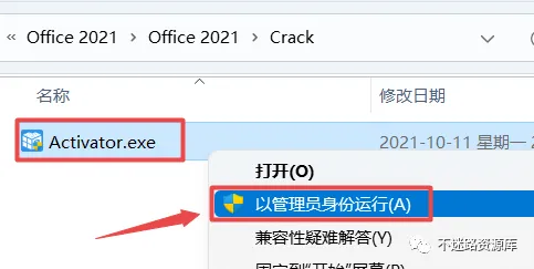 6.返回之前解压的“Office 2021”文件夹,双击打开“Crack”文件夹,找到并选中“Activator.exe”,鼠标右键点击“以管理员身份运行”