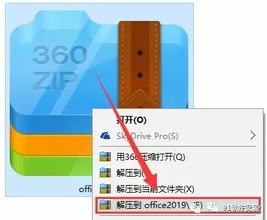 软件下载完成后,右键点击安装包弹出框选择“解压到office2019”。如下图:
