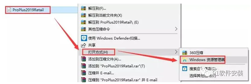 4、如下图,右键点击”ProPlus2019Retail”,然后选择”打开方式”,再选择“Windows 资源管理器”。
