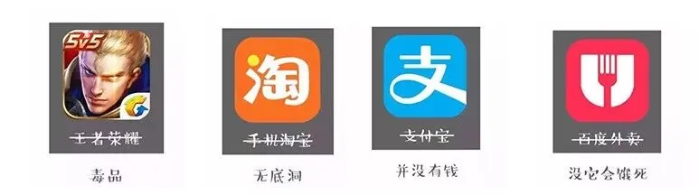 当然还有一些“船新”的不能碰版本, 如《王者荣耀》被称为“农药”、“毒品”;淘宝被称为“无底洞”;支付宝叫“并没有钱”;百度外卖(现在是美团外卖)叫“没它会饿死”……