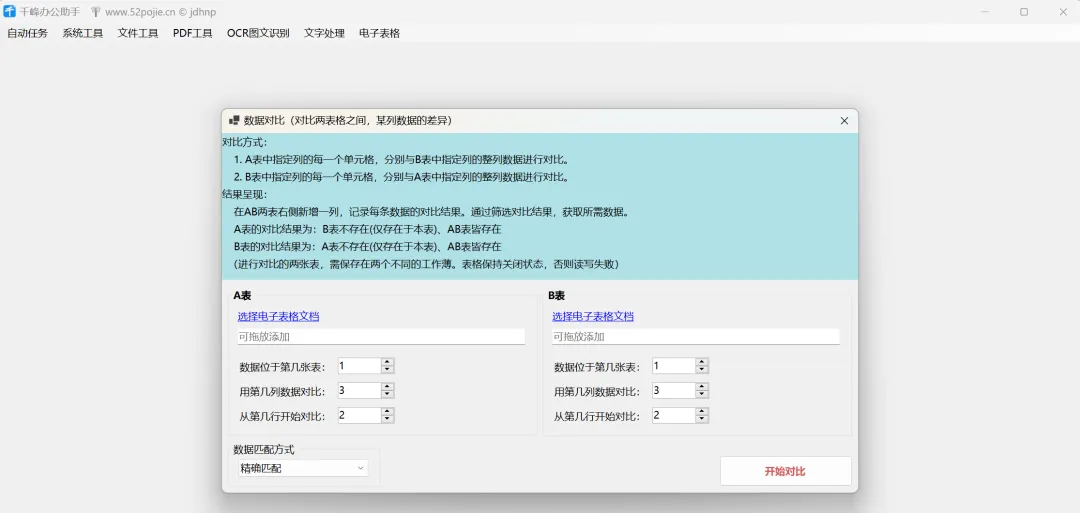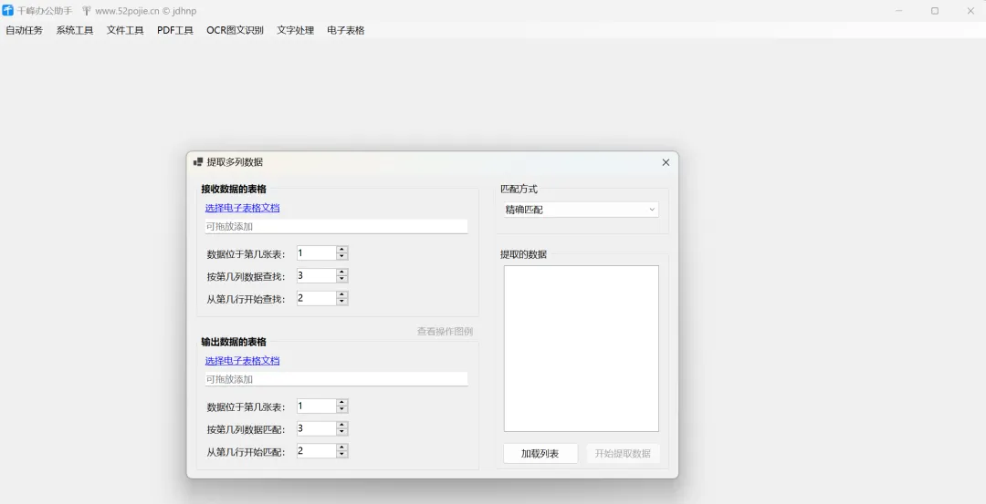 软件第三大功能就是电子表格相关功能,软件支持单表拆分为多表、多表合并为单表、数据对比、数据提取、工作薄拆分为多工作薄、制作考场桌贴门贴等功能