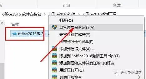 7、点击安装包里的office2016激活工具文件夹,鼠标右击office2016激活工具,选择以管理员的身份运行