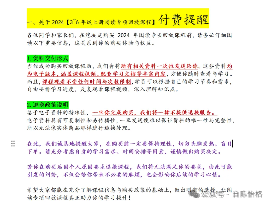 各位同学和家长们,在您决定购买2024 年阅读专项回放课程前,请务必仔细阅读以下重要信息,这关系到你的购买体验与权益。