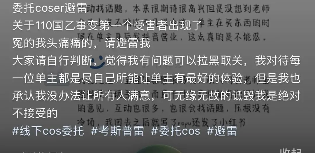 小红书上的「Cos委托」的避雷账号上,目前为止就积攒了数万粉丝、数千投稿。其中大多,都是「单主」在私下吐槽这些花钱买到的不适。