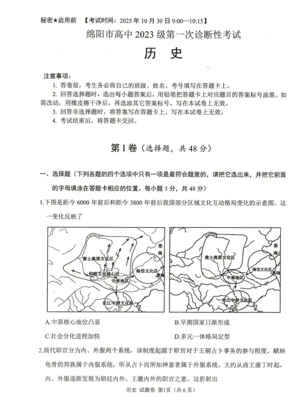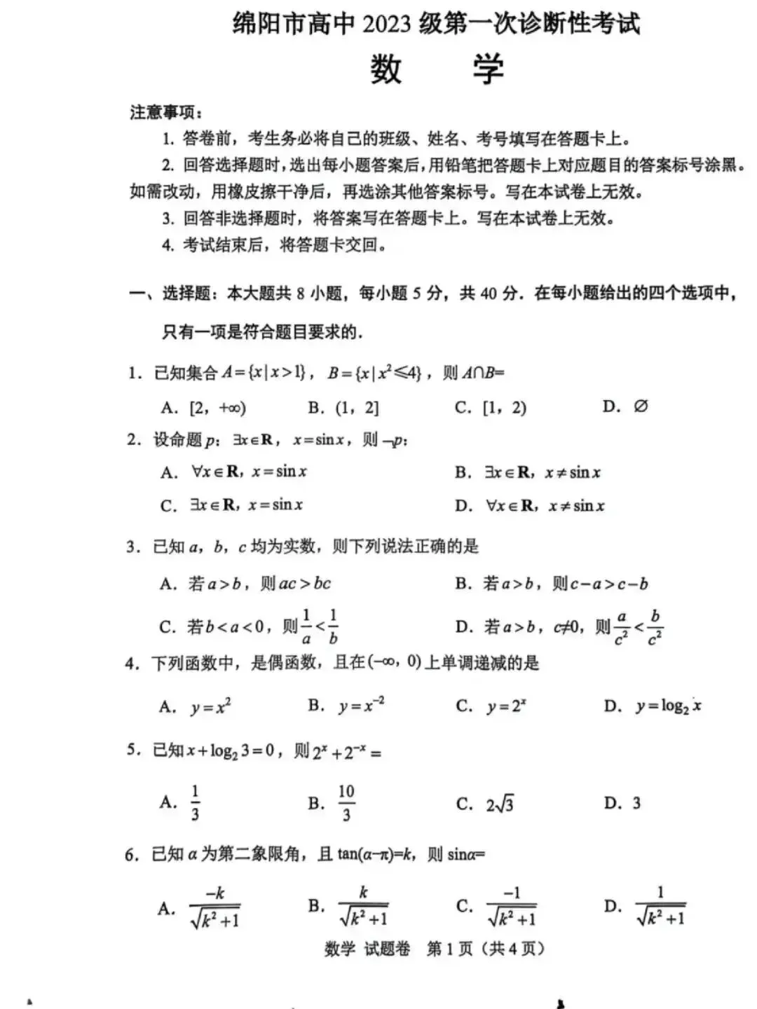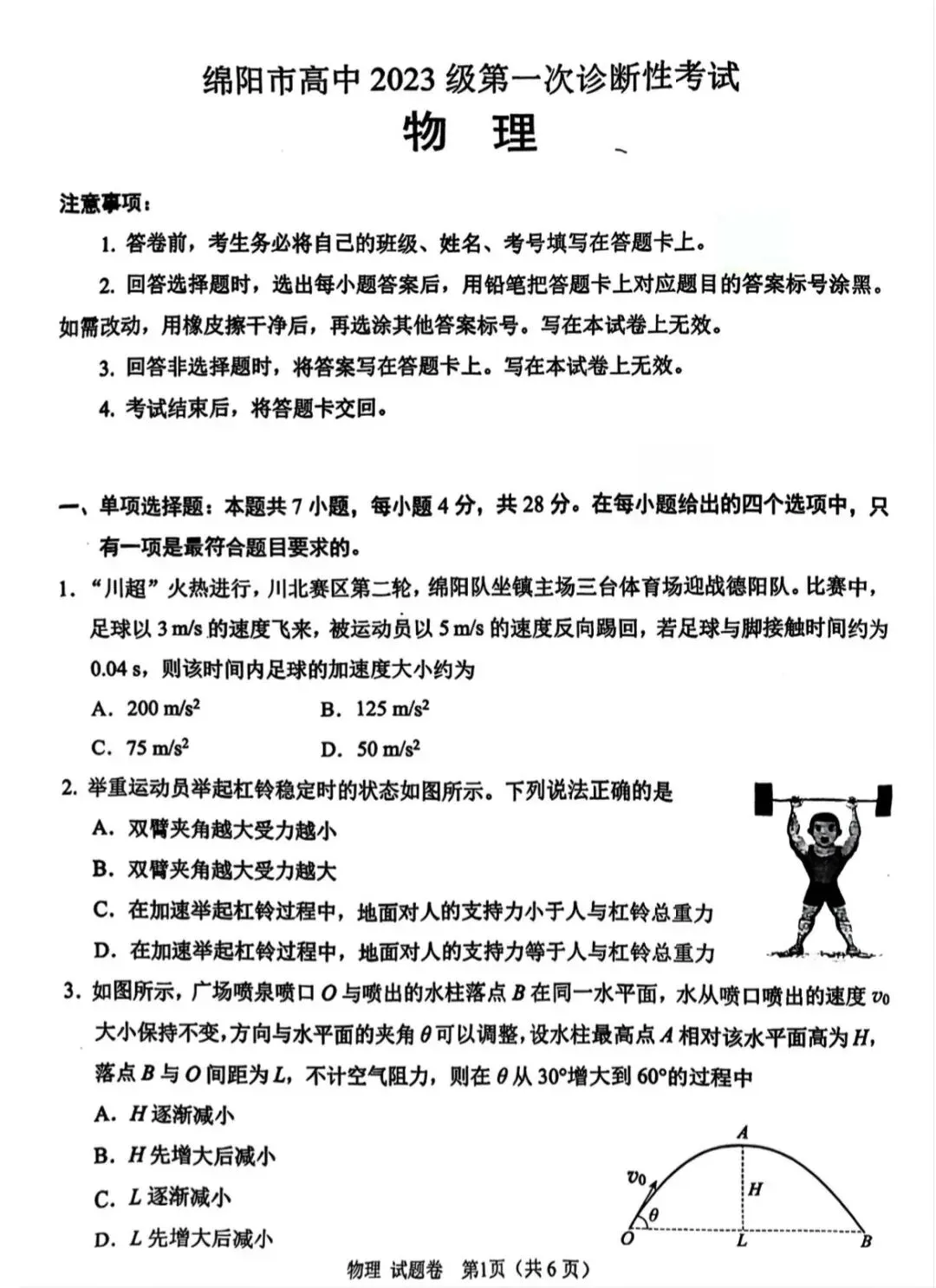 【PDF版】2025年绵阳高三一诊试卷+答案,持续更新!