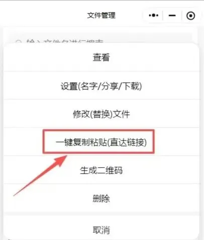 3、上传成功后,在文件管理页面中找到刚上传的文件,点击“…”选择“一键复制粘贴(直达链接)”按钮,跳转到下个页面,点击“一键复制”。