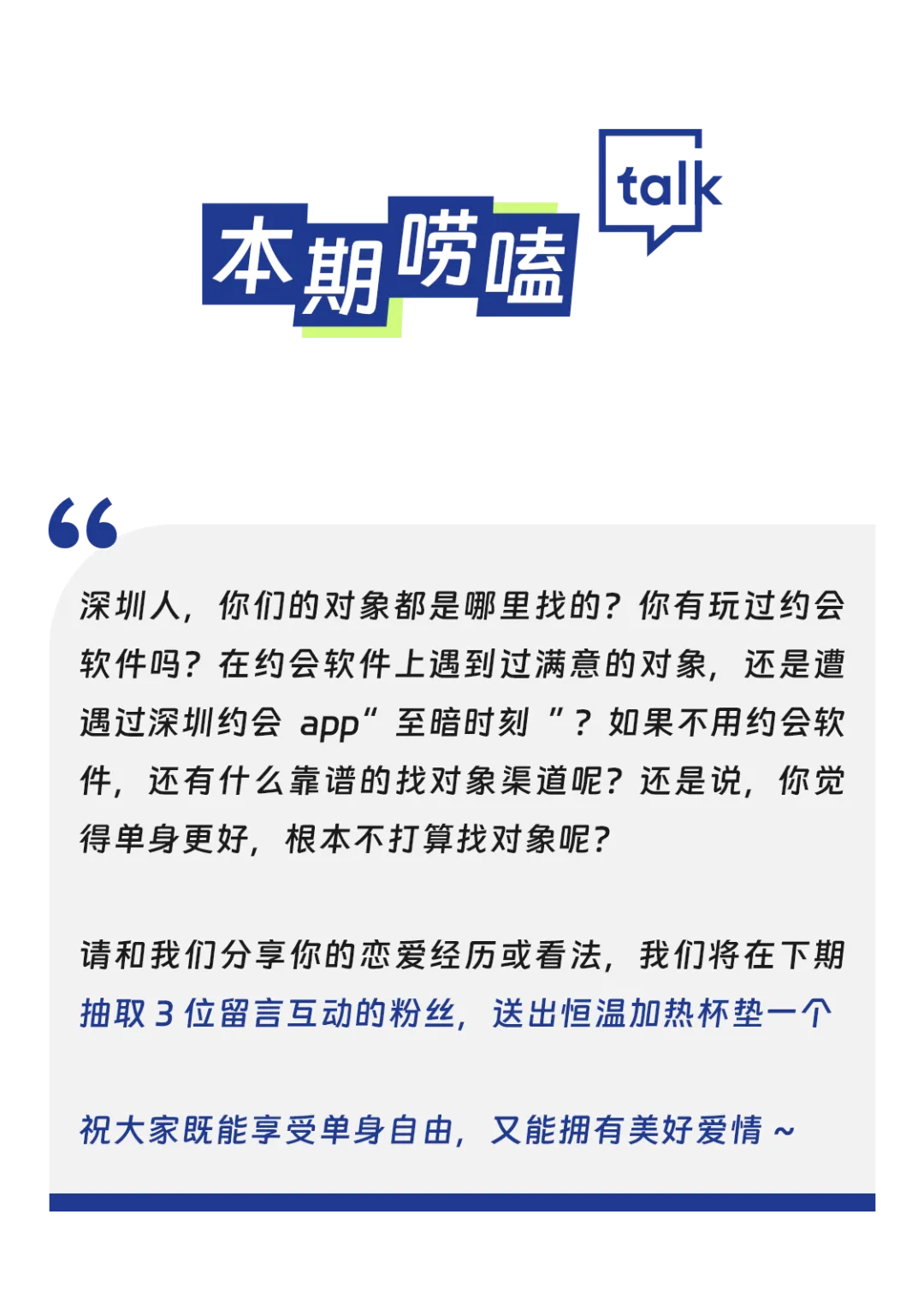 在深圳的你,玩过约会软件吗?你有没有遭遇深圳约会app的至暗时刻?你觉得通过约会软件能找到对象吗?如果不用约会软件,还有什么靠谱的找对象的渠道呢?