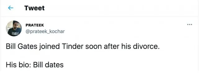 在比尔刚离婚时,有网友立刻发推说,立马准备改变约会软件Tinder的地理位置,这样就能和比尔盖茨配对了