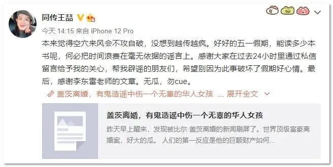 随后,王喆还发出了一条澄清微博:“无瓜,勿cue”。