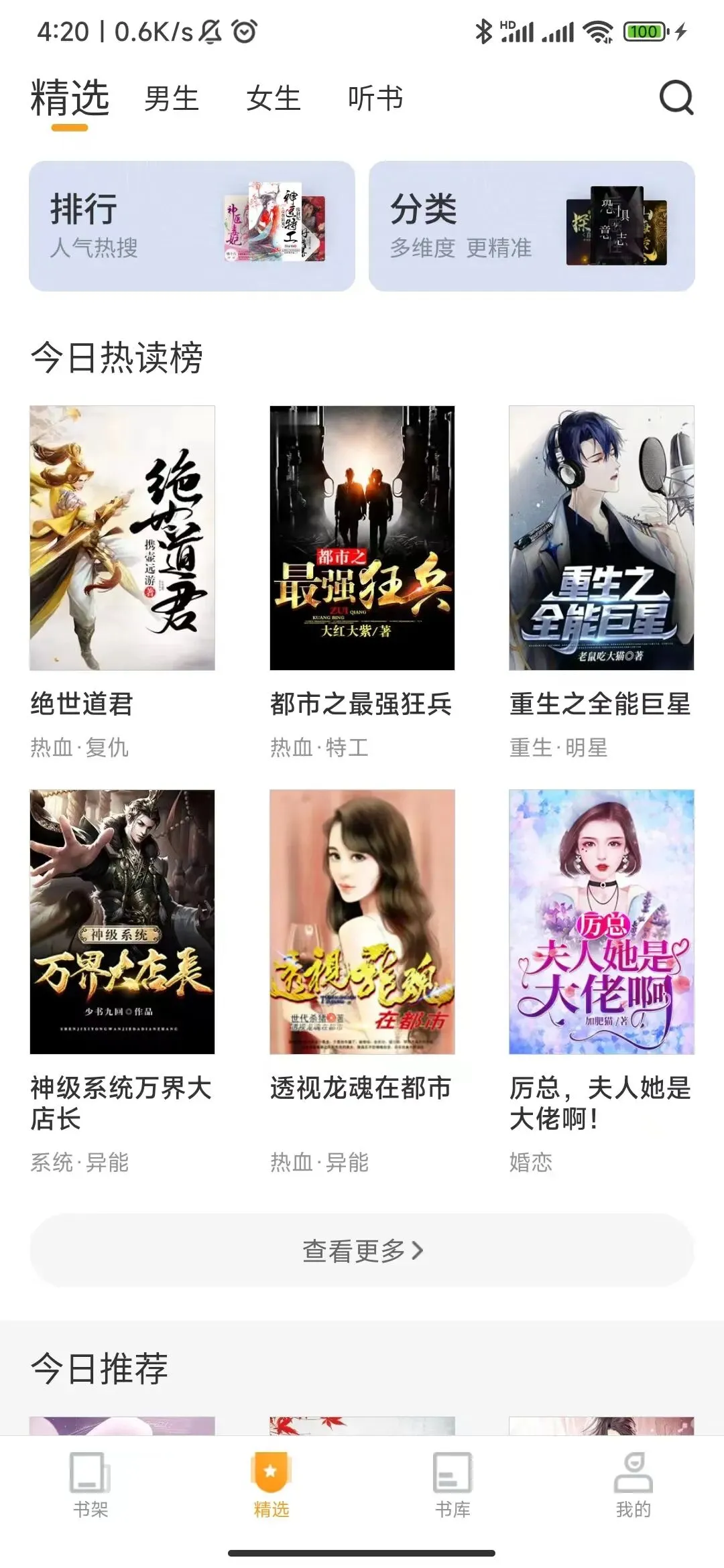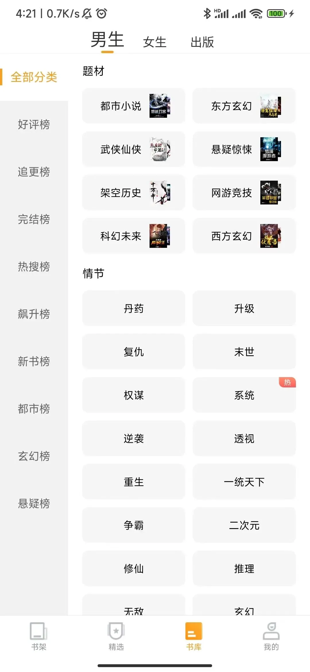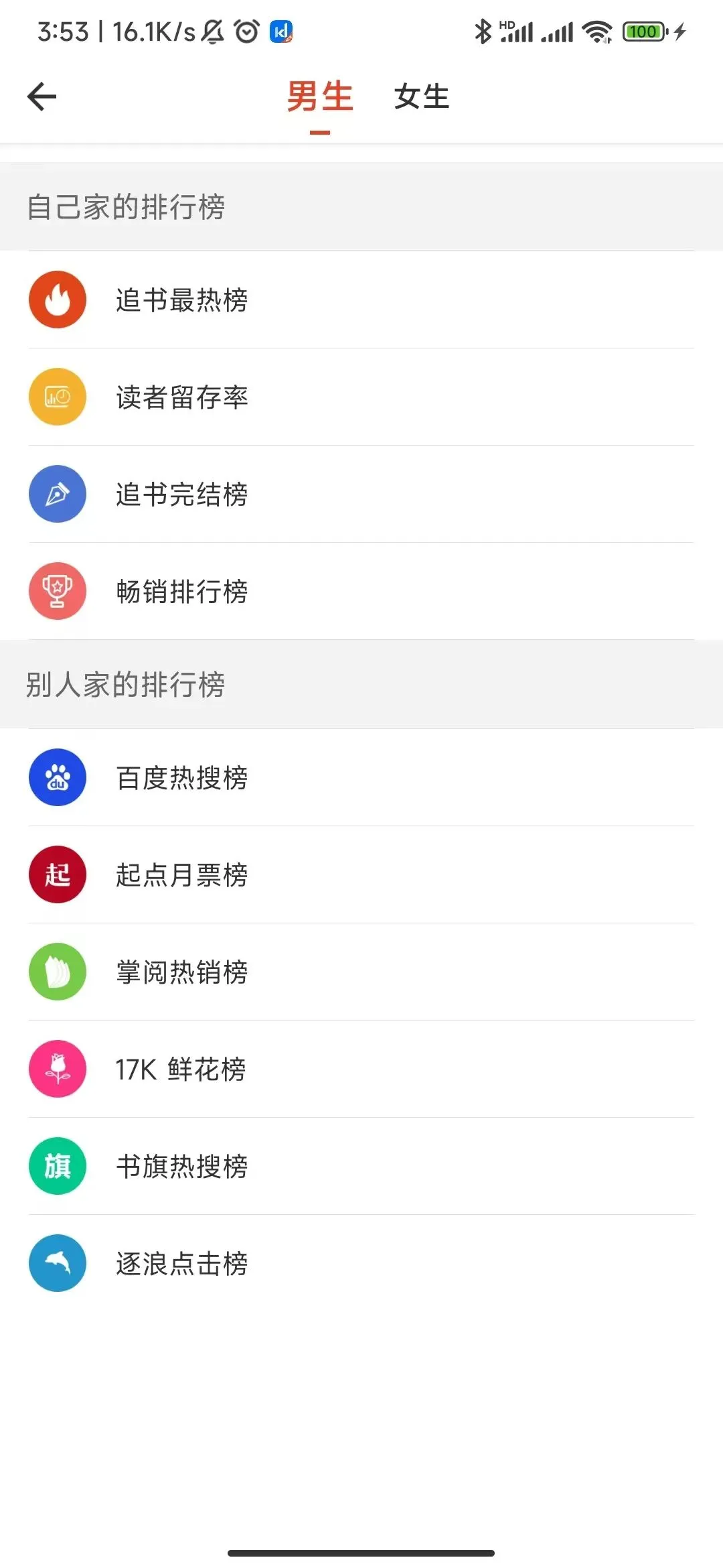 支持榜单阅读,分男生板块女的板块,更新及时,非常不错的一款看小说工具!
