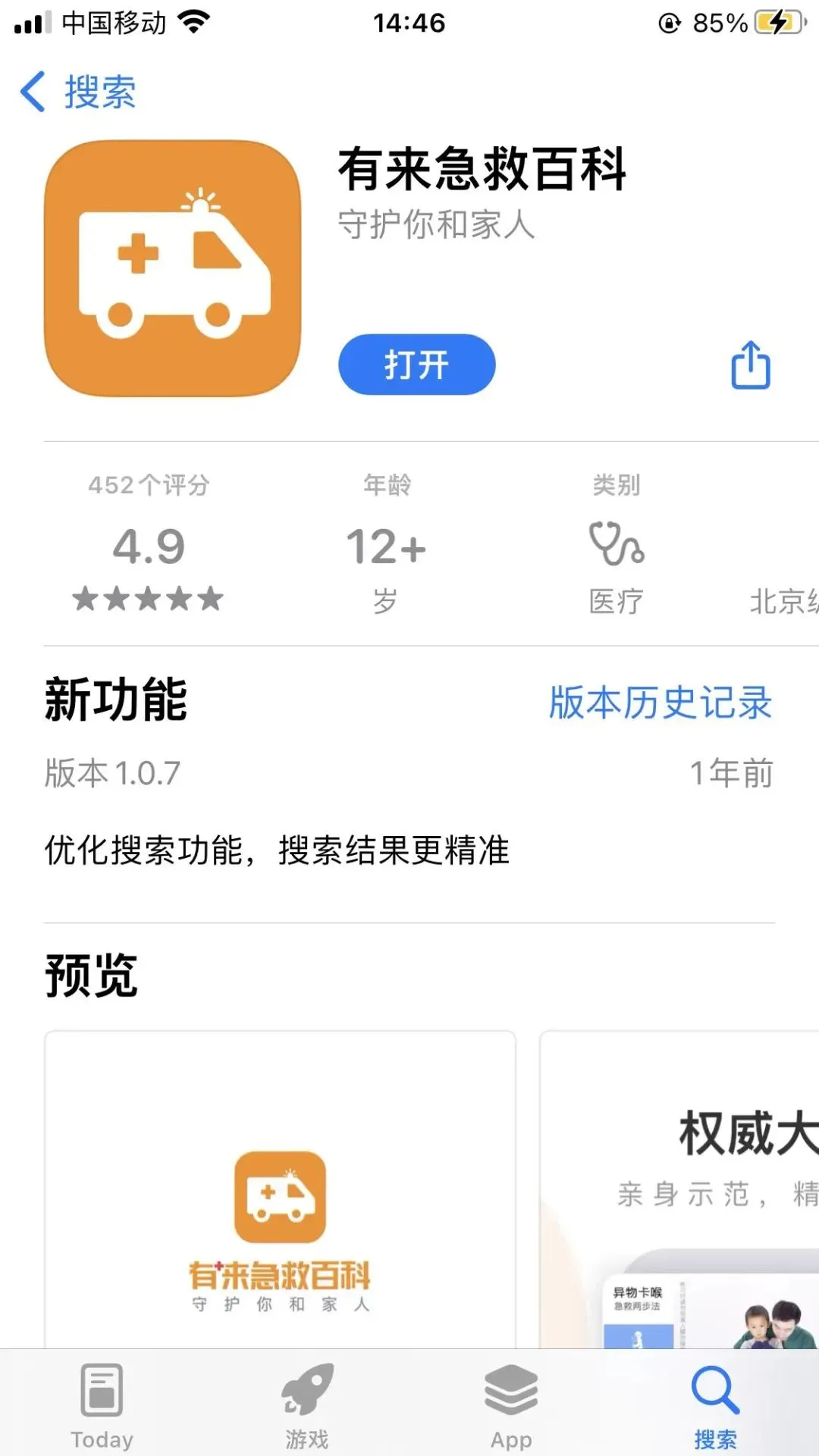 这款app在商店评分高达4.9分,可见其受欢迎程度。它是一款集急救科普、突发公共事件响应、急救培训与服务以及急救产品为一体的专业急救平台。