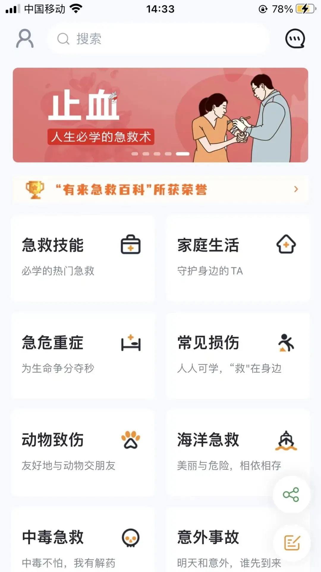 软件首页非常简洁,内有个类型的急救方法,囊括急救技能、家庭生活、急危重症、常见损伤、动物致伤、海洋急救、中毒急救和意外事故等等。