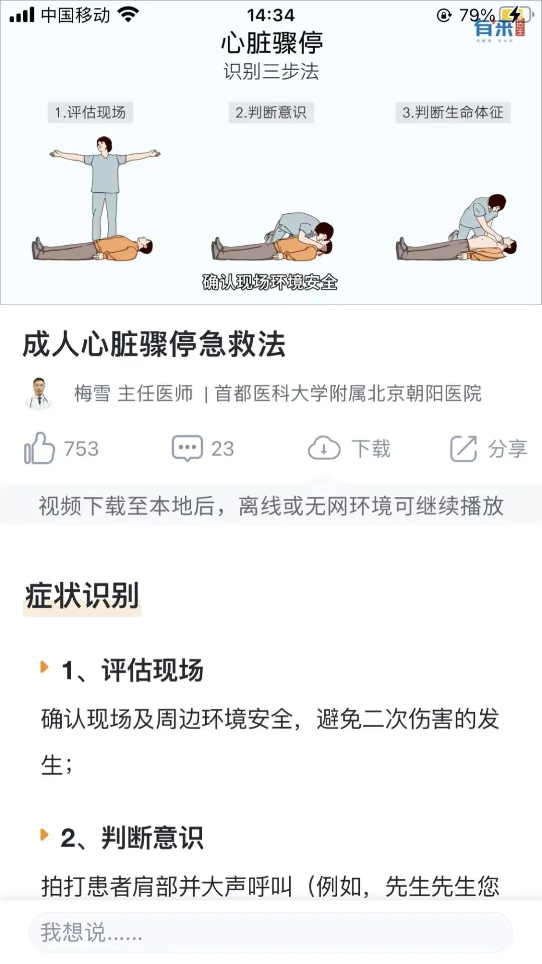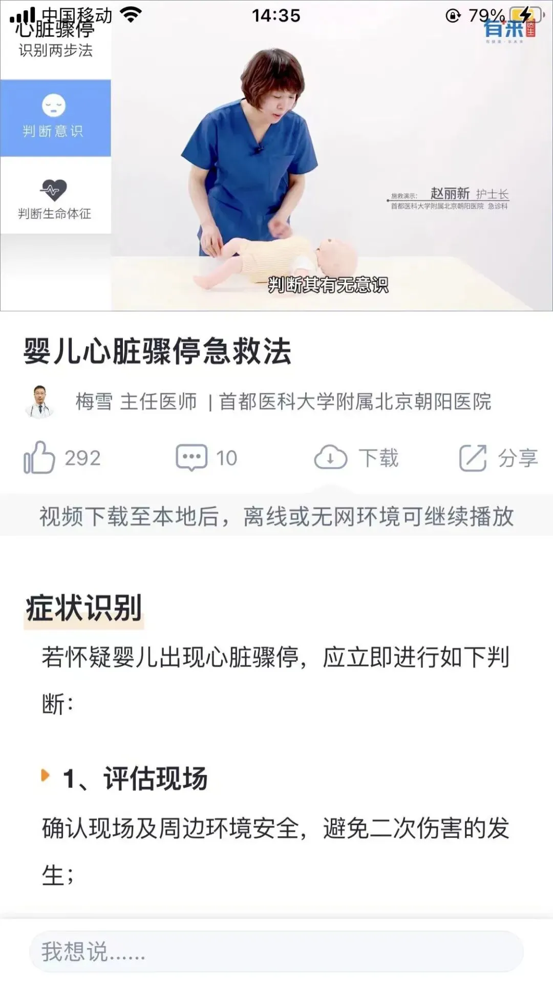 以成年人和婴幼儿心脏骤停如何复苏为例,里面有非常详细的步骤和处理方法讲解,讲解的医生都是三甲医院里面的医生,还有专门的视频操作手法,可谓非常的良心,让我们学起来也容易。