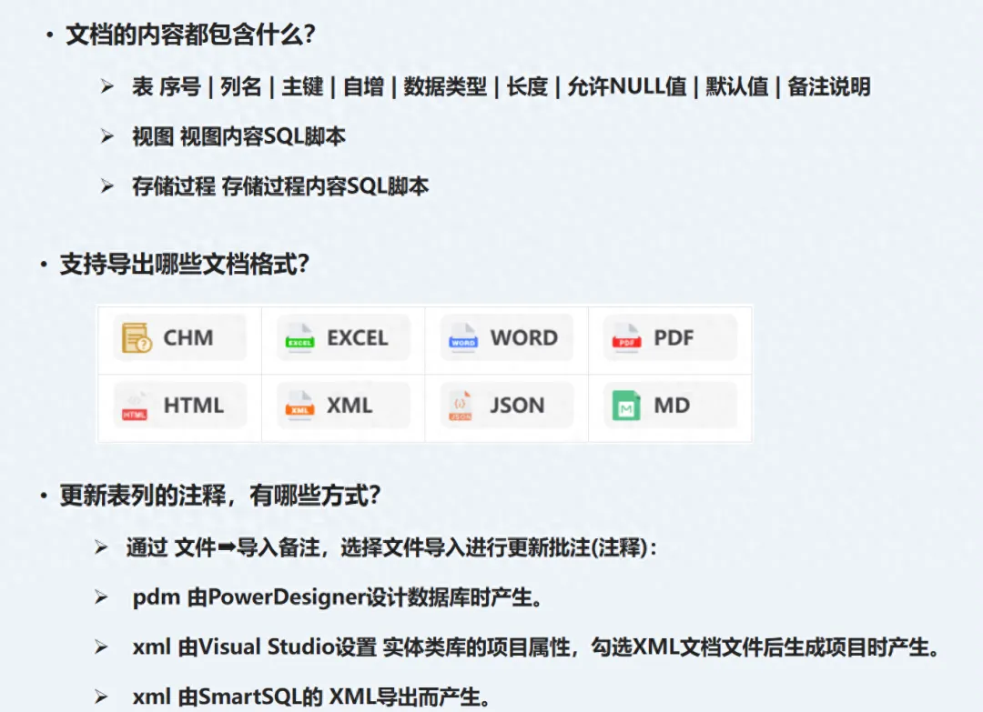 SmartSQL 是一款方便、快捷的数据库文档查询、导出工具!该工具从最初支持CHM文档格式开始,通过不断地探索开发、集思广益和不断改进,又陆续支持Word、Excel、PDF、Html、Xml、Json、MarkDown等文档格式的导出。同时支持SqlServer、MySql、PostgreSQL、SQLite等多种数据库的文档查询和导出功能。
