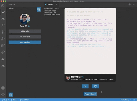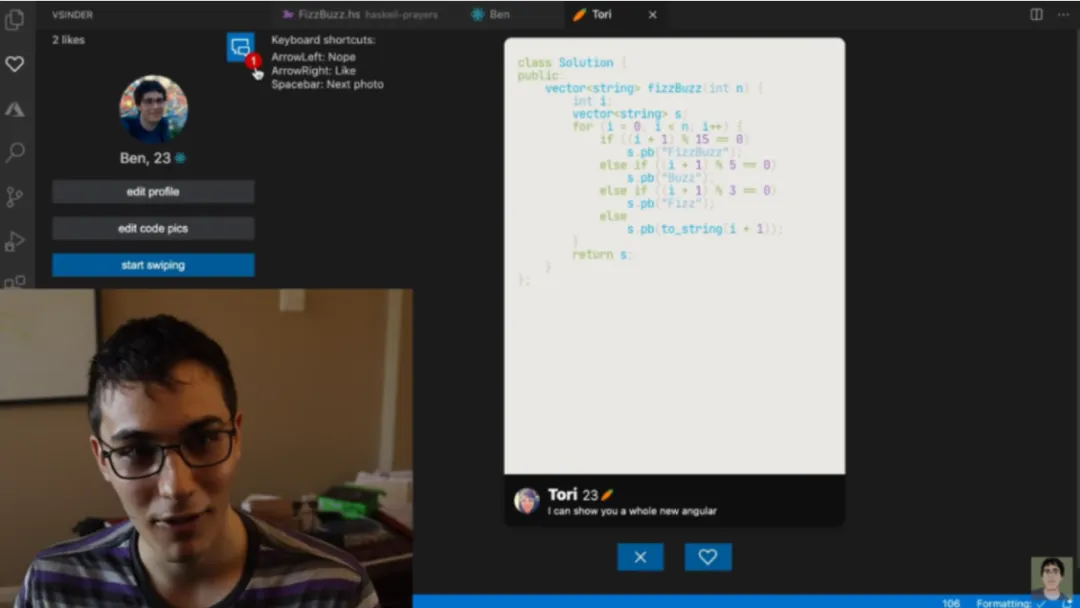 继通过游戏模拟器将 VS Code 变身小霸王游戏机之后,又有开发者将约会软件集成到 VS Code 中。该项目名为 VSinder,为 VS Code 和 Tinder 的组合,由 23 岁程序员 Ben Awad 开发。