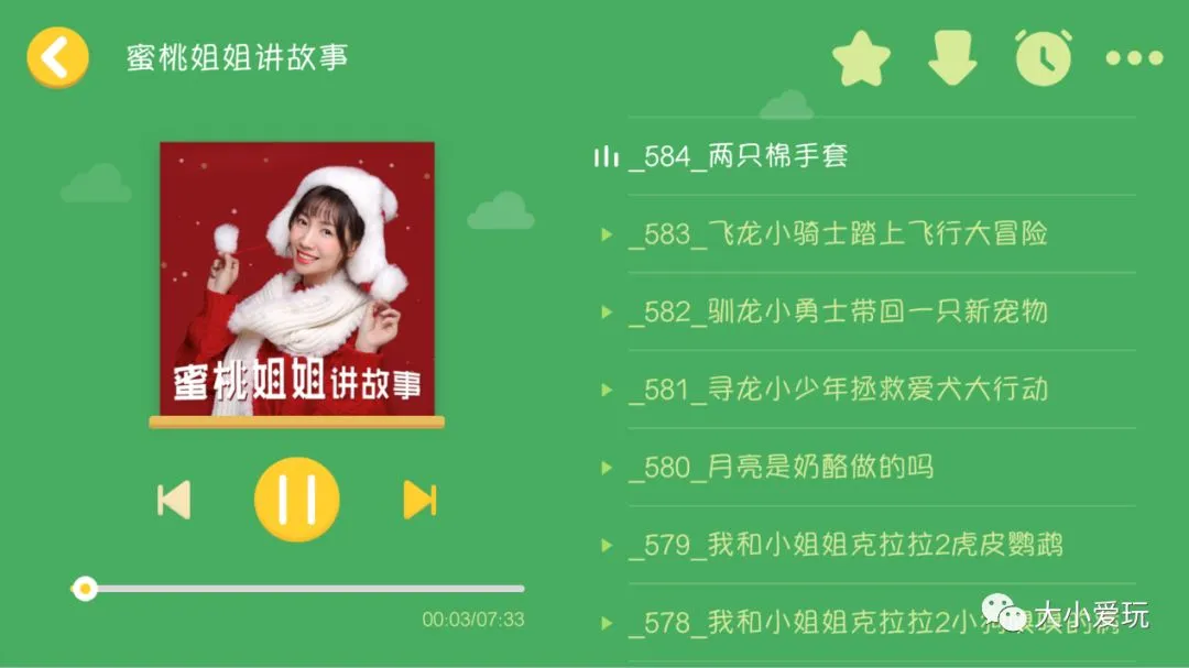 小爱还很喜欢只听声音功能,点击一下,关闭屏幕画面,孩子只用耳朵听,也会很开心。当然也可以选择电视投影,大屏幕不伤眼哟~
