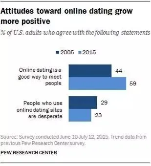 然而,最近一项来自美国皮尤研究中心(Pew Research Center)的调查显示,相比于十年前,人们现在对线上约会的态度已逐渐变得积极,网络约会只是用来寻找性伙伴的“污名”也逐渐变淡。