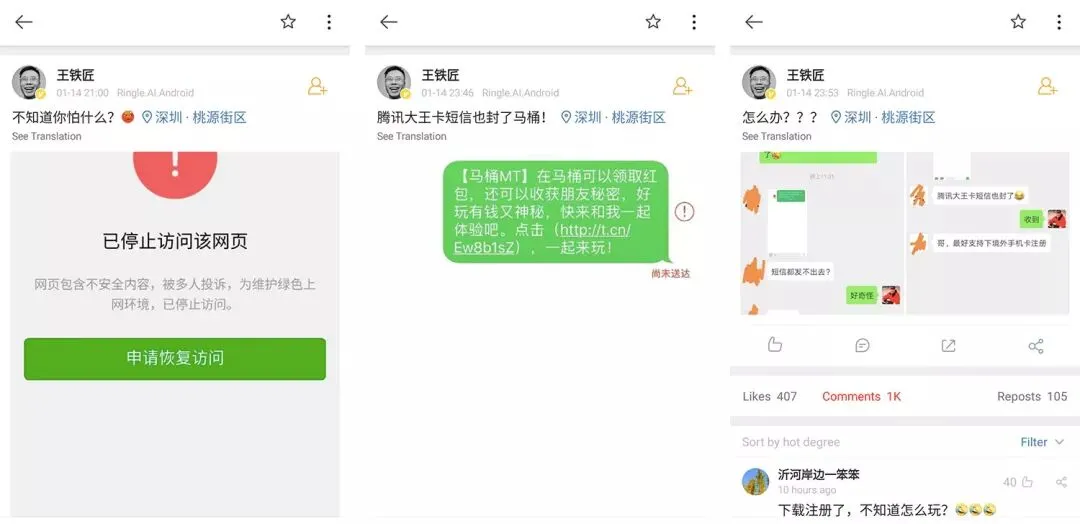 14 日当晚,王欣连发三条微博,先是贴出马桶 MT 官网在微信中被停止访问的截图,发问「不知道你在怕什么?」随后惊呼「腾讯大王卡短信也封了马桶!」附图为马桶 MT 邀请好友的短信显示无法送达,紧接着又发微博询问「怎么办?」给人以惨遭微信封杀的受害者的感觉。