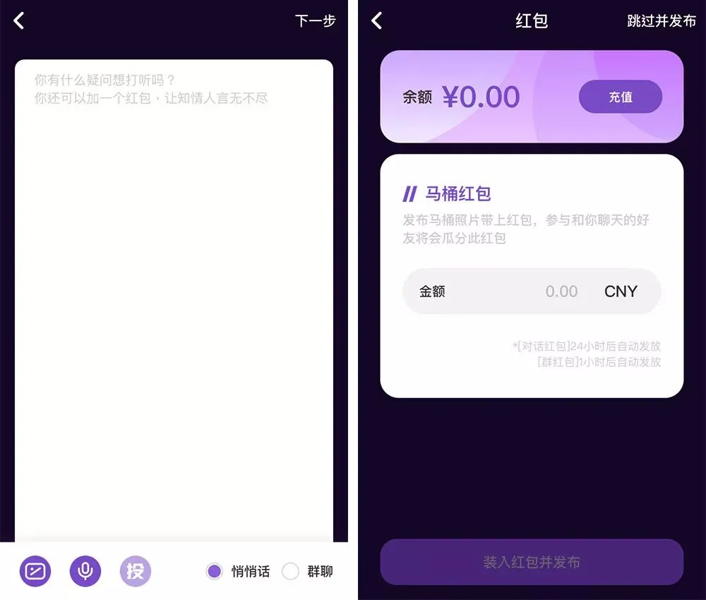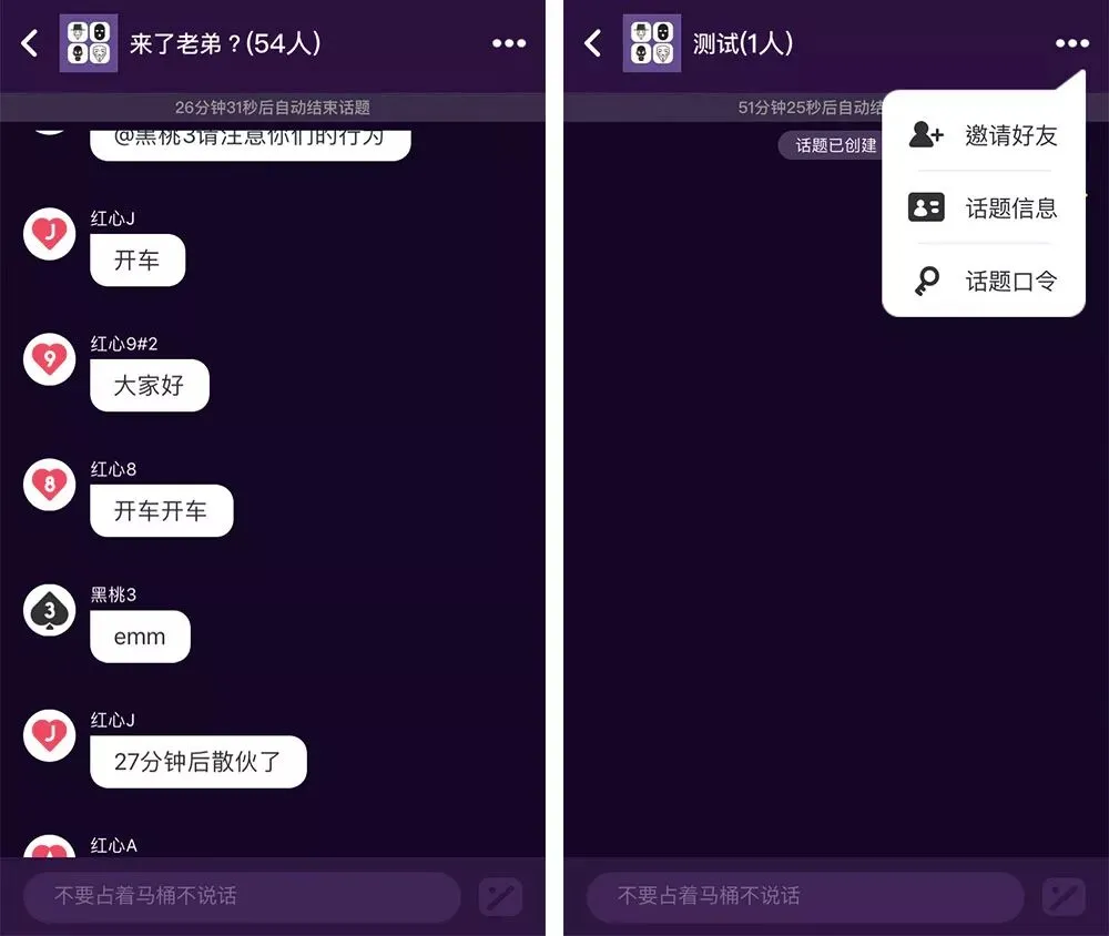 在「话题」栏目下点击左上角的加号,即可创建新话题,分为「悄悄话」和「群聊」两种模式,并可设置红包,参与聊天的用户将自动瓜分红包,形式近似于付费问答。所有的话题时效性只有 1 小时,到点自动解散,管理员亦可提前结束话题。