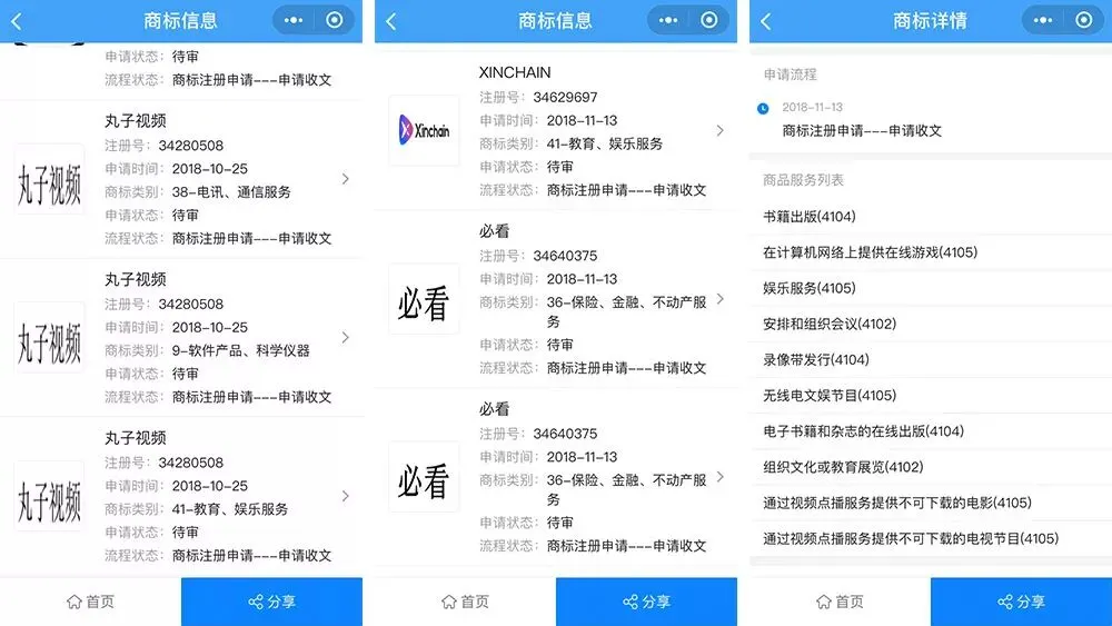 此外,天眼查显示云歌提交了多个商标注册信息,比如欣链 Xinchain,类目为保险、金融、不动产服务,这或许涉及到数字货币交易;必看——商品服务列表包括「通过视频点播服务提供不可下载的电影/电视节目」,大概是一个视频平台。另外还有口令电话、Xinplay(新链播放器)、丸子视频等从名字即可看出功能的商标。