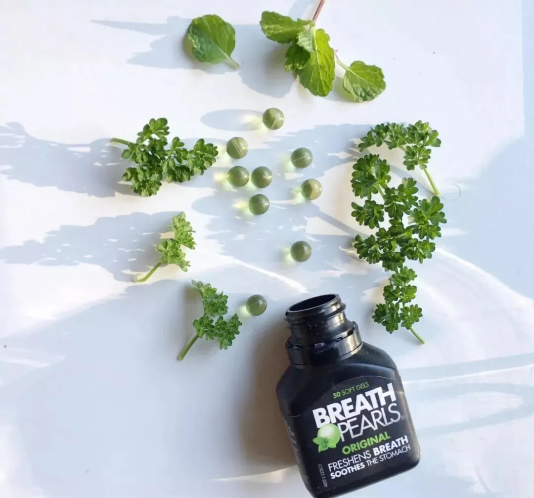 绿色是薄荷结合西芹籽油。这是除口臭的口服胶囊。