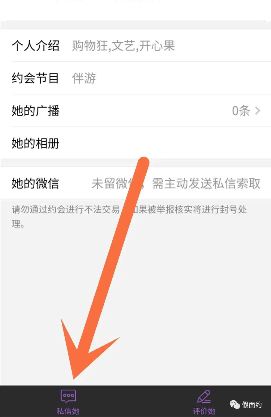 “假面约”公众号菜单栏->立即约会进入后,点击要联系的男/女会员头像,进入详情页。点击左下角“私信Ta”图标。