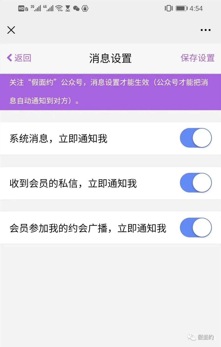 点击“假面约”消息中心->右上角按钮,可以对不同类型的消息通知进行设置。