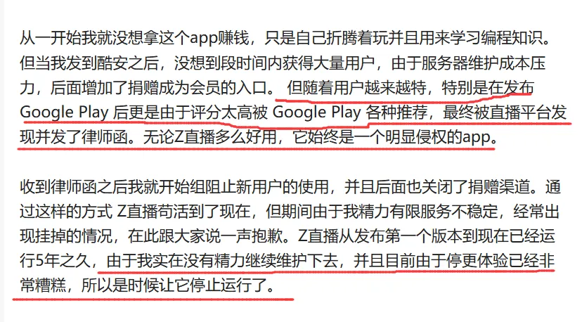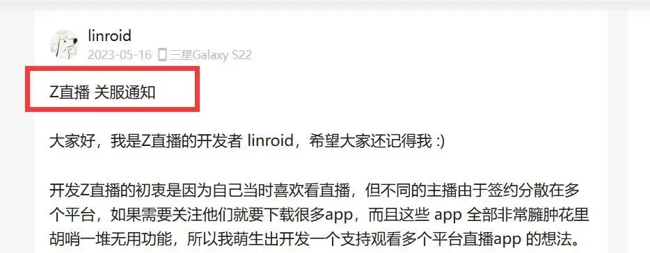 2023 年 5 月,开发者 Linroid 在酷安发帖,正式宣告了 Z 直播的关停。