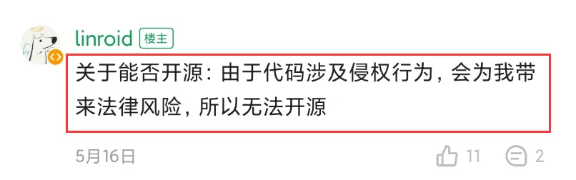 同时,由于代码涉及侵权行为,会为开发者带来法律风险,开发者表示,Z 直播无法开源。
