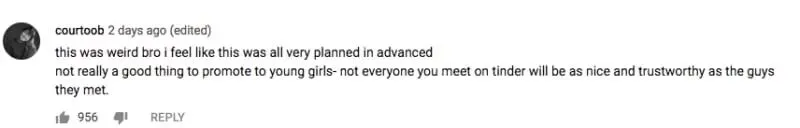 “这个视频好奇怪,我感觉这都是事先安排好了的。给年轻的小女孩提倡这种事情真的不太好,你在软件上遇到的男人并不是都那么这个视频中那么友好和值得信赖的。”