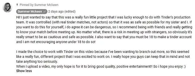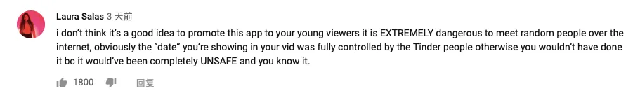 “我并不认为把这个软件推荐给你的年轻观众很好,事实上,去约见各种网络上来路不明的人极其危险,很明显,你视频中约会的对象肯定是被这个软件的人筛选好了的,否则你也不会真的去见他们,因为你也知道这事儿本来就很不安全。”