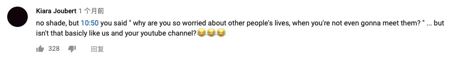 “10分50秒的时候你自己说了,为什么你们都这么关心别人的生活呢?这辈子可能都不会遇见他们呀。这不就指的是我们和你的油管频道吗?笑cry”