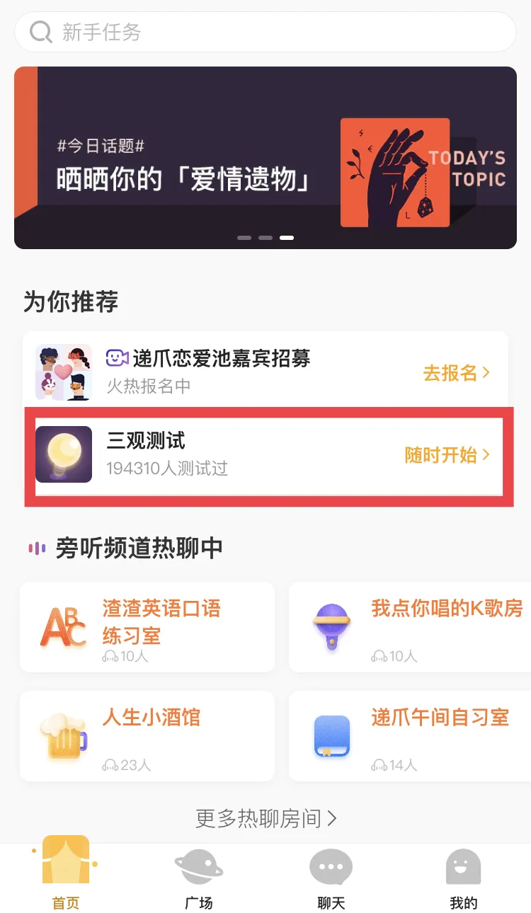 在递爪上,你可以先测三观再聊天,选择一个喜欢的话题,和三观一致的小伙伴开麦畅聊。