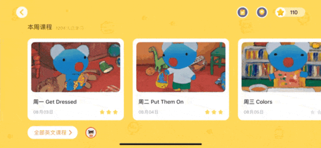 每日英语课堂是小小优趣最近重磅推出的功能模块,由【看动画】、【学英文】、【小复习】3个环节组成。