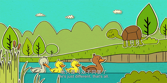 其中的丑小鸭这个故事让我很有感触,很多版本都是丑小鸭丑得连自家的家人甚至妈妈都嫌弃它,而Super Simple这个版本里鸭妈妈对丑小鸭是无条件的爱,当别人说丑小鸭不好看时,鸭妈妈一直坚定地维护自家的孩子He’s just different(他只是与众不同)。