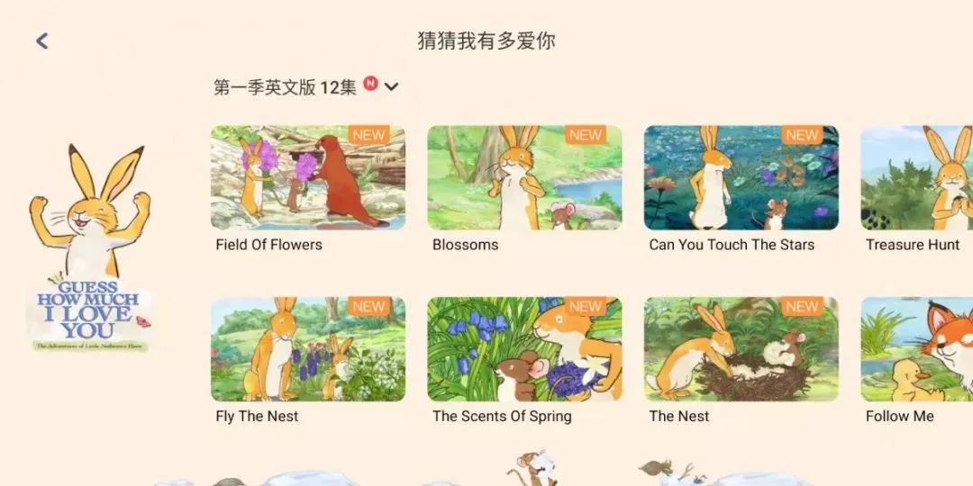 除了童谣外,小小优趣还引进了很多原版动画片,比如孩子们都爱的《猜猜我有多爱你》同名动画全系列。所选的动画片不论是教育属性和还是美感,都不是一般的平台可比的。