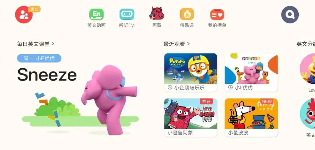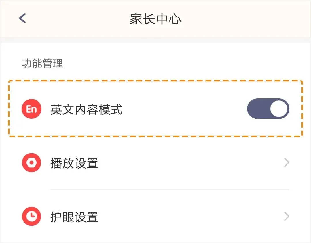 可以选择纯英文模块:家长可根据需要进行全英文/双语播放模式的切换。在家长中心—功能管理中,选择【英文内容模式】,即可屏蔽中文动画内容,实现沉浸式英文启蒙学习,也可选择中英双语模式,这样中文动画也能继续看。